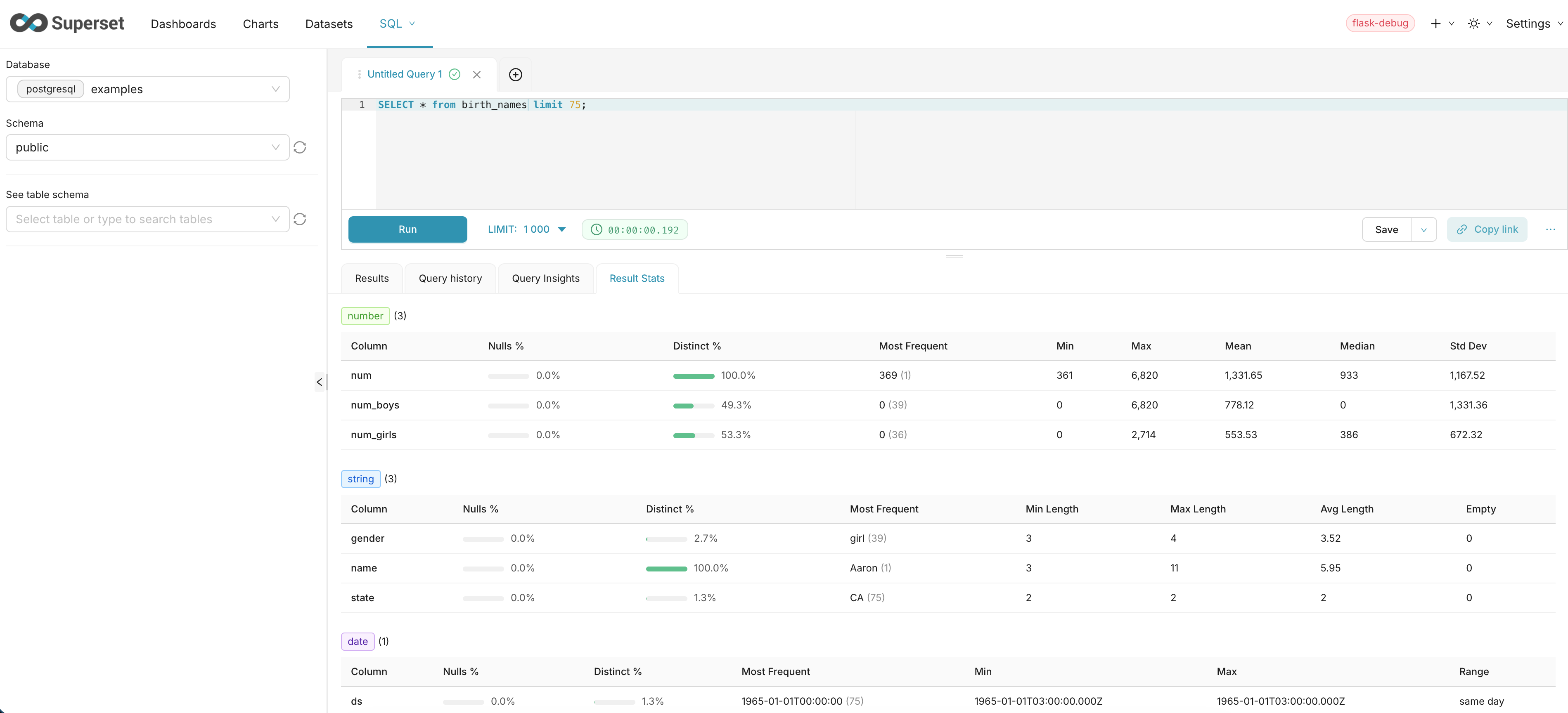 | SQL Lab Result Stats | A SQL Lab extension that automatically computes statistics for query results, providing type-aware analysis including numeric metrics (min, max, mean, median, std dev), string analysis (length, empty counts), and date range information. | Michael S. Molina | ![]() |